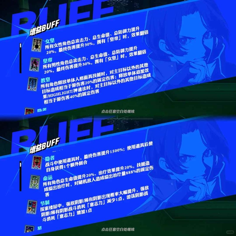 卡片推荐:太阳(刚需)、隐者、倒悬者、愚者、女皇+皇帝(高额增伤+生存)、星+命运(高额生存)、节制+月亮(减意志力消耗)