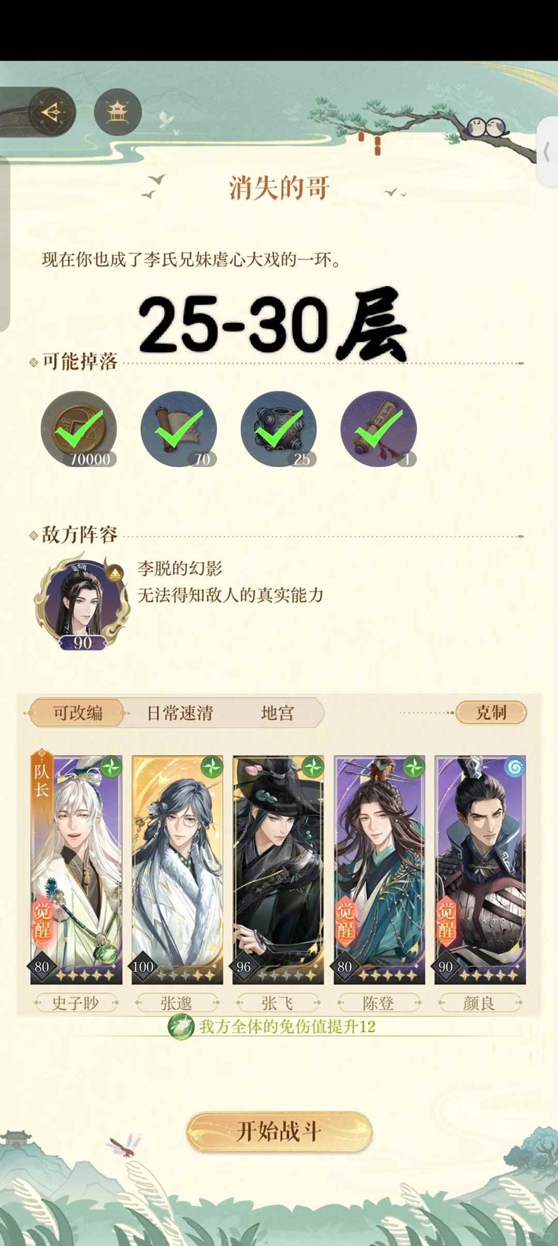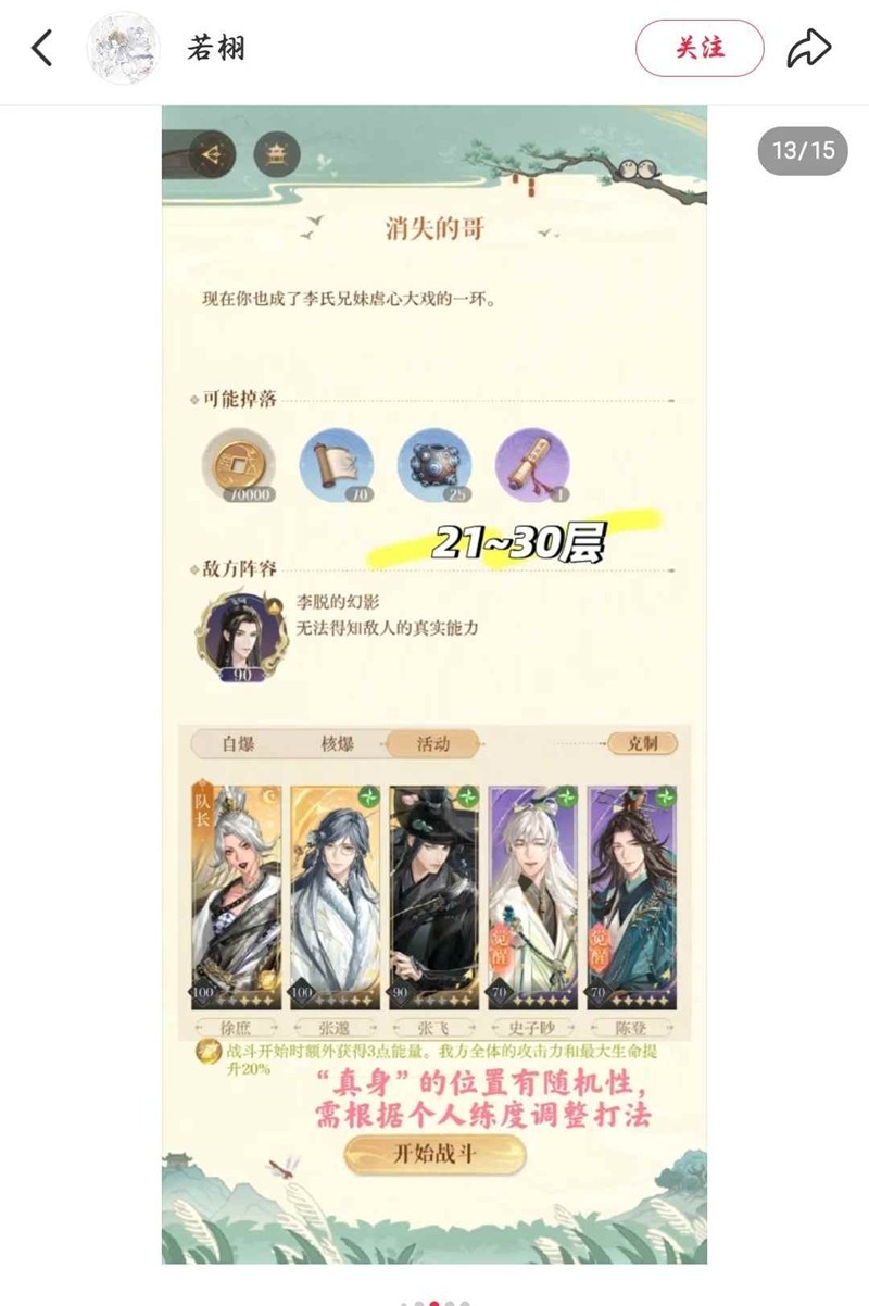 如果跟我一样打李脱25-30层就是差伤害,没有多余星石的情况下就可以用我自己的用的配队,实测有效,就是李脱真身血量30%以下之后,李脱大招回合,颜良开大,其余下拉,如果史君有大就放大,李脱普攻回合就正常打,有大放大,无大平a,颜良只在李脱大招时放大就行。