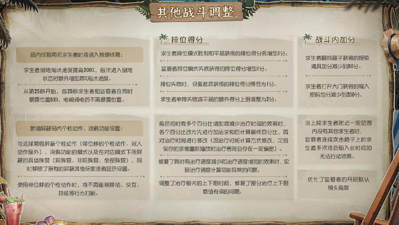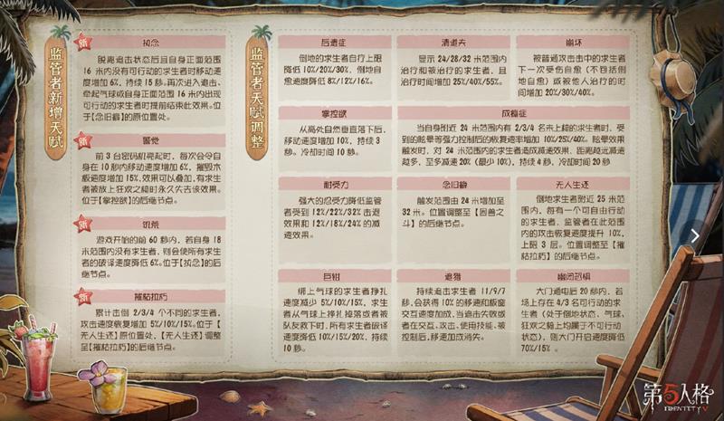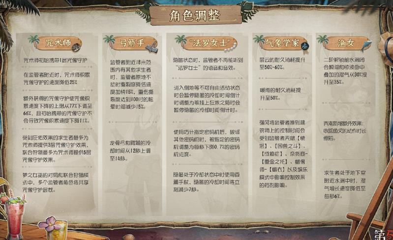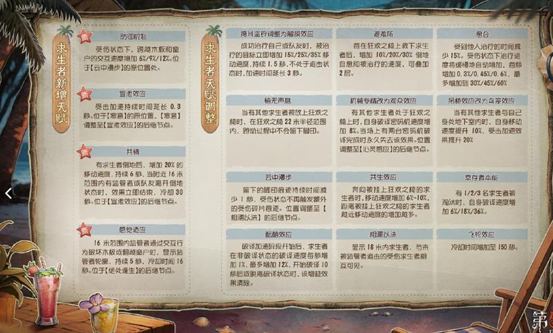 本次更新对部分角色的技能进行了优化和调整。例如,求生者阵营中的某些角色技能得到了增强,使其在对抗监管者时更具优势。同时,监管者阵营也进行了相应的平衡调整,确保双方在对局中能够保持公平的竞技环境。具体调整内容如下: