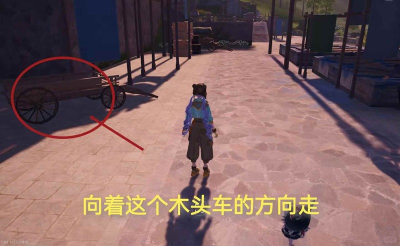 可以看到一辆 木头车,朝着木头车的方向走,就可以看到史丢丢贴画啦。(・∀・)