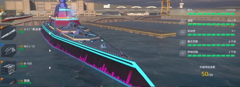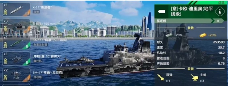地平线级战舰在攻防两端都有不错表现。奥托76主炮具备自动防空功能,海星导弹配合HUWS鱼雷能打出8万爆发伤害。3个防空槽采用弯曲+海红旗组合,手动操作时需要优先拦截高威胁导弹。RBU-6000反潜火箭炮进一步提升了综合战力,是攻守兼备的优秀选择。
