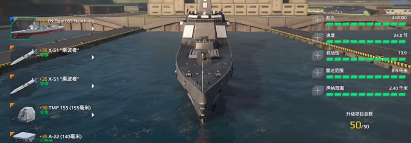 055南昌舰以其均衡性能著称。3个导弹槽可装备X51乘波者导弹,3座TMF155暴击主炮在中远距离威力十足。2个鱼雷发射管搭载的旗鱼鱼雷近战伤害高达8万。6个防空槽配备海拉姆和铠甲-M系统,需要手动优先拦截反舰导弹。适合喜欢中距离游走战术的指挥官。