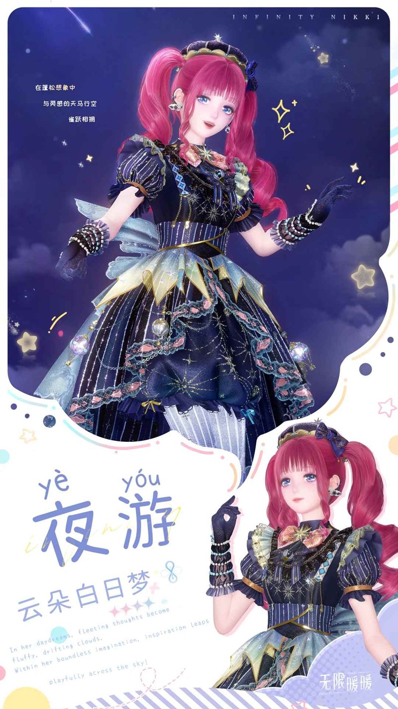 无限暖暖是一场收集美好的冒险之旅,暖暖将和大喵一起,游历奇迹大陆上风土文化各异的幻想国度,邂逅形形色色的人与充满奇思妙想的生物,并能够通过各种途径收集不同风格的精美套装。旅途中,暖暖和大喵也会遇见神奇的境况、难解的谜题——两人齐心协力克服困难,是彼此冒险路上最好的伙伴。无限暖暖全新套装奇想衣橱,云朵白日梦即将上线,一起来和小编看看吧~