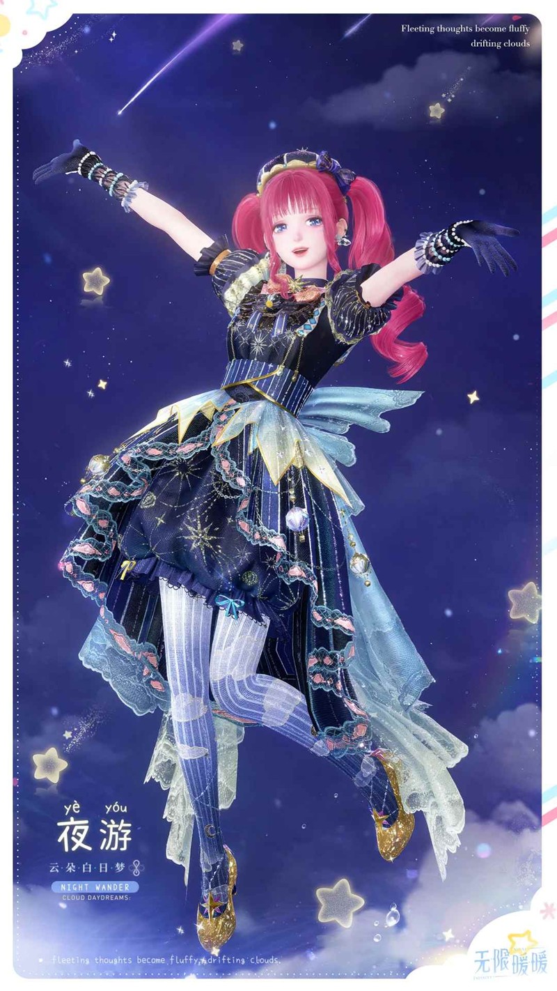 「云朵白日梦」进化后为套装「云朵白日梦·夜游」。套装焕新完成后可获得「云朵白日梦·碧影」。