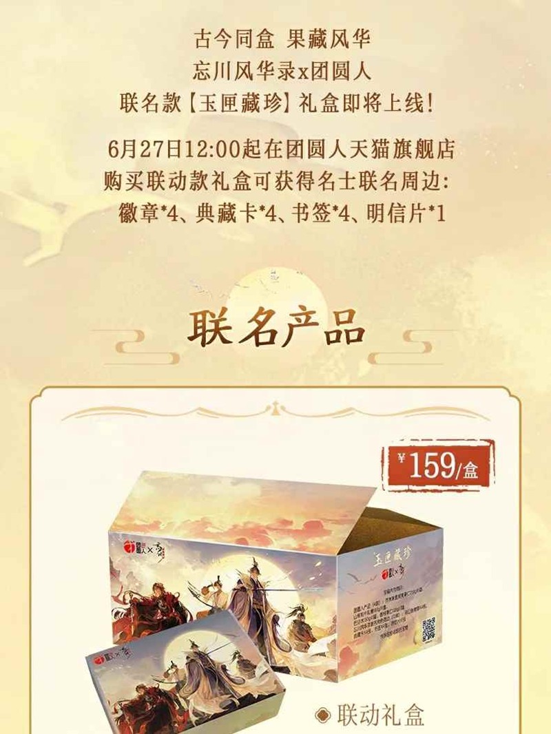 感谢各位使君关注和期待,忘川风华录x团圆人联名坚果礼盒【玉匣藏珍】将于6月27日12:00正式开售,联动嬴政、朱棣、刘彻、刘秀4位千古帝王,邀使君执掌山海之味,随盒附赠联动主题全套周边礼盒,以六合奇珍共飨忘川盛筵! 即日起,前往天猫"团圆人旗舰店"即可查看联动详情~