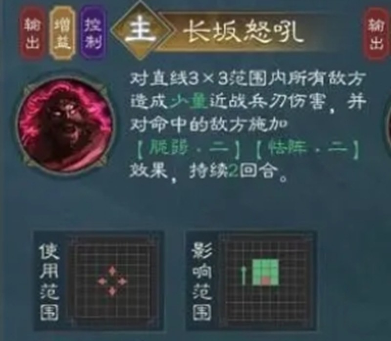 主动技能长坂怒吼能对直线3x3范围造成近战兵刃伤害,并施加脆弱和怯阵两种负面效果。脆弱降低敌方30%防御,怯阵减少15%暴击抗性,持续2回合。另一个注定技能万军取首可造成大量单体伤害,同时恢复自身生命值。