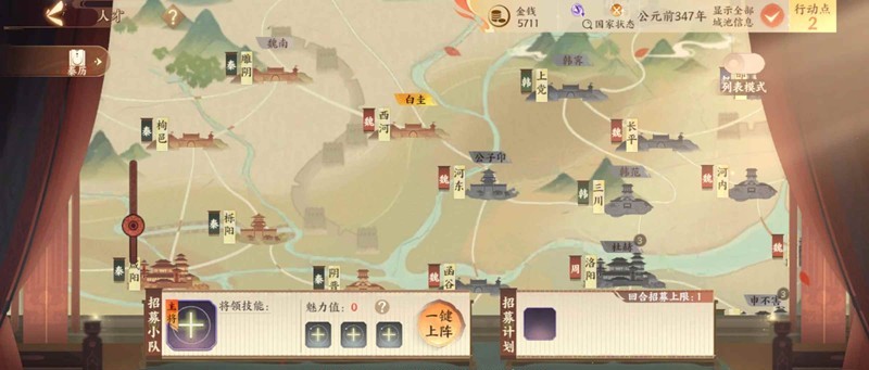 1.开局第一个回合其实没什么事做的,内政也加的不多,喜欢赌一把的可以直接招商鞅,说不准就招到了。(如果招到了,第二轮的求贤令可以用去招募巴蜀的杜逸,这人军事近80,而且很长寿!可以当很久的工具人)接下来尽快把巴蜀这俩地拿下。