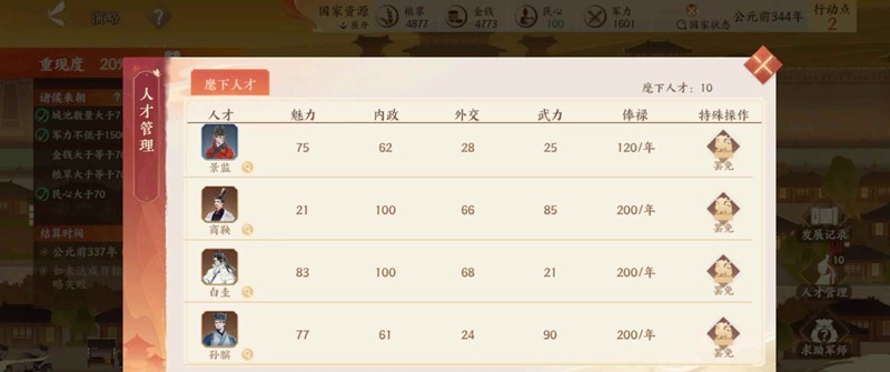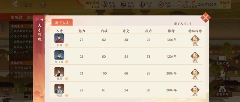 之后看着来,前期所有城池都守,打你的都不会出太多兵。然后在第一个任务的时候有一个人才,非常好用!而且在这个模式里他很长寿!甚至到了后面樗里疾司马错出来了还能用一会才寿终正寝。