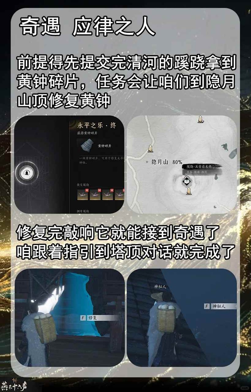 做起来也挺简单的,不过前提得先提交完清河的蹊跷拿到黄钟碎片,任务会让咱们到隐月山顶修复黄钟,修复完敲响它就能接到奇遇了,咱们跟着任务指引就行,到塔顶对话能看见非常唯美的动画就完成了。