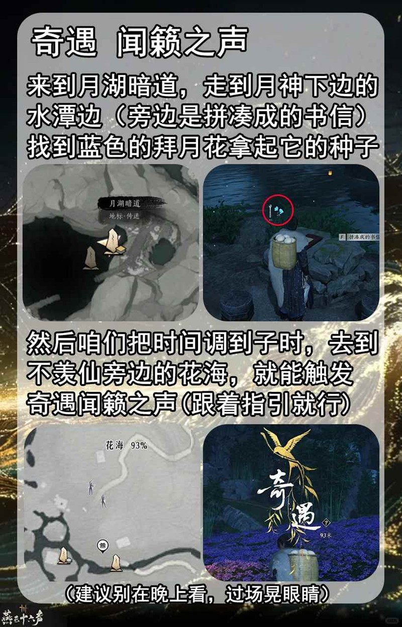 然后咱们把时间调到子时,去到不羡仙旁边的花海,就能触发奇遇闻籁之声了,俺们也是跟着指引走就行了,是不是很简单而且场景也非常好看嘞,不要忘记拍照噢!