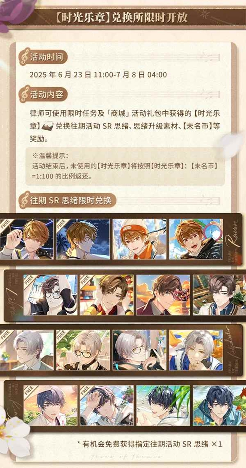 律师可使用限时任务及「商城」活动礼包中获得的【时光乐章】兑换往期活动SR思绪、思绪升级素材、【未名币】等奖励