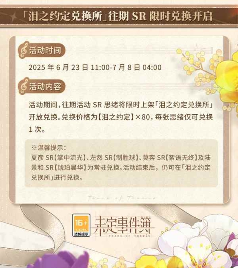 ※初代小贴士:夏彦SR【掌中流光】、左然SR【制胜球】、莫弈SR【絮语无终】及陆景和SR【琥珀昙华】为常驻兑换。活动结束后,仍可在「泪之约定兑换所」进行兑换