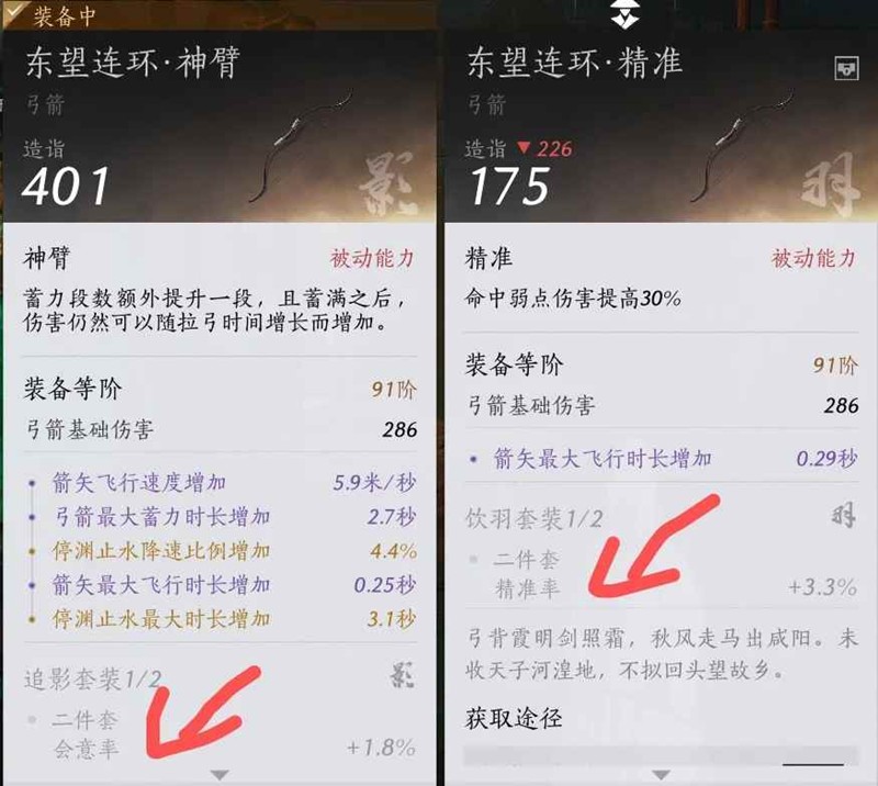 1、金弓、玦:由于之前金弓、玦对于副本没有伤害提升,本次更新优化了金弓、玦增加套装效果,主要分为精准率、会意率、会心率三种,根据主播的理解,剑类的流派需要制作追影套(+1.8%会意),其他流派就需要制作会心套了(主播还没做出来这个金弓,没有截图,有做出来的可以发一下),饮羽套(3.3%精准)作为通用流派使用。另外本次增加金弓金玦的保底机制,好像50次就可以做出大保底了,不要再担心做不出金弓玦了,另外要注意的是也不能随便做金弓、玦了,不仅要做出来,还得做出套装的,不然套装无法生效。