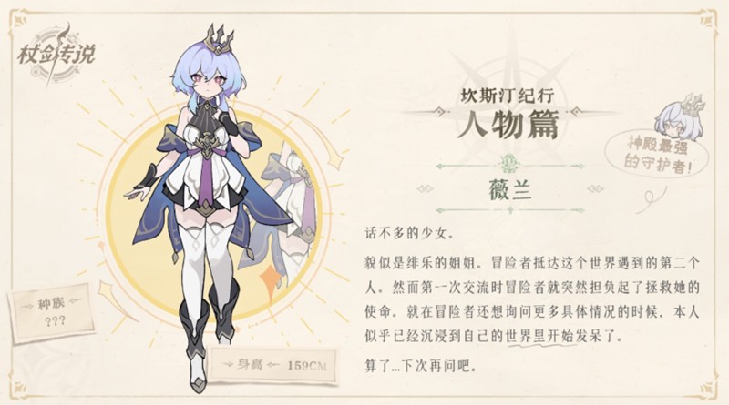 游戏初期玩家遇到的第二个角色就是薇兰,她有着标志性的蓝色短发和可爱的外表。初次接触时会发现她有些天然呆的性格特点,但正是这种特质让她在众多NPC中脱颖而出。随着剧情推进,玩家会逐渐了解到更多关于她的故事。