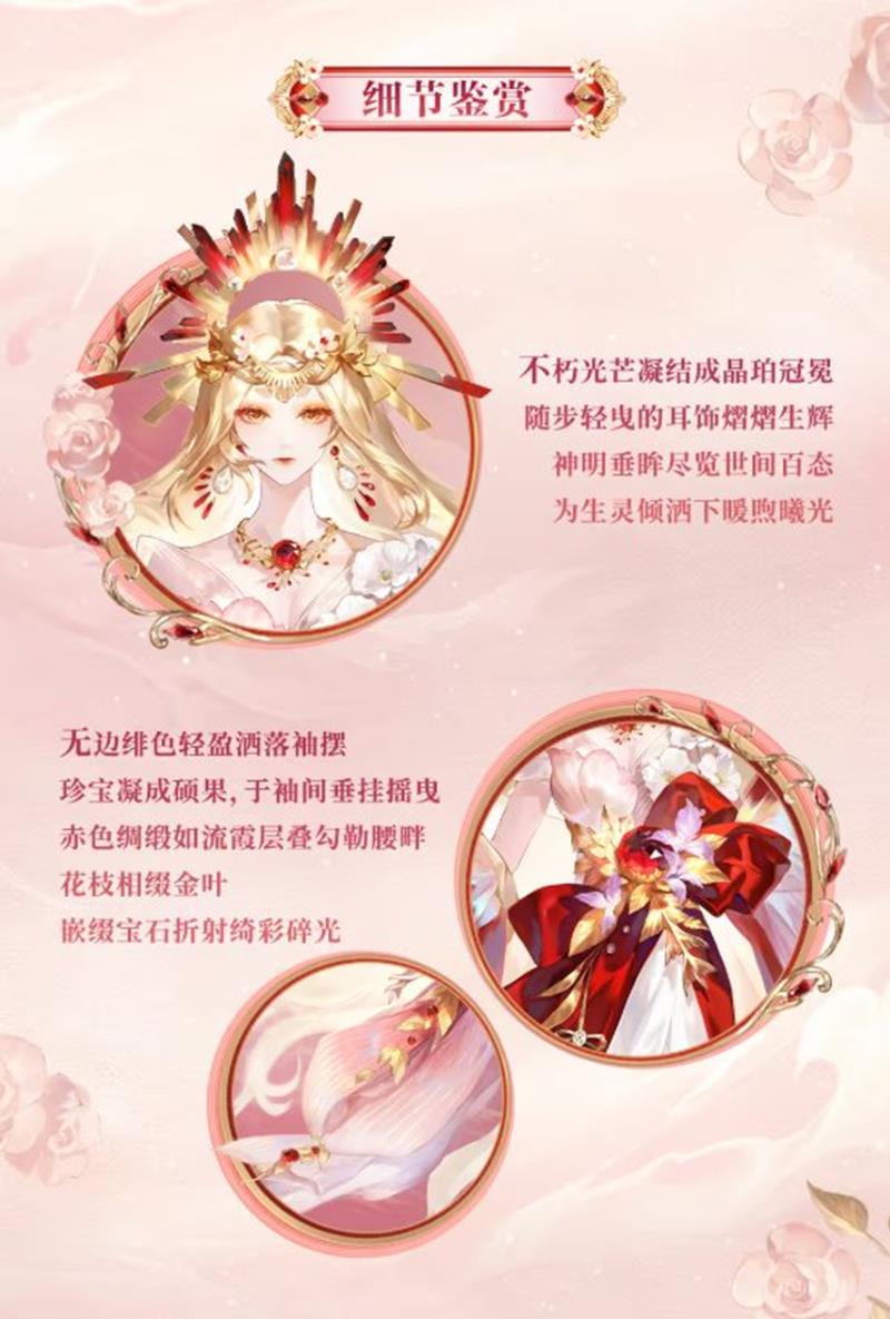 天照限定宝石主题系列新皮肤「绯穹炽冕」即将上架皮肤商店。无边绯霞轻盈洒落衣摆,珍宝凝成硕果于袖间垂挂摇曳,流光溢彩的瑰丽红晶,闪耀着永恒不变的佑世晖光,所及之处焕发盎然生机。