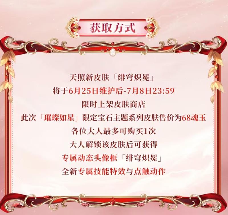 天照新皮肤「绯穹炽冕将于6月25日维护后-7月8日23:59限时上架皮肤商店,此次「璀璨如星」限定宝石主题系列皮肤售价为68魂玉各位大人最多可购买1次。