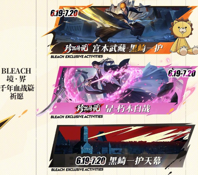 宫本武藏的黑崎一护和暃的朽木白哉这两款传说品质皮肤可以通过"BLEACH祈愿"活动获取,活动时间为6月19日至7月20日。后羿的石田雨龙皮肤将在上线首周开放88皮肤碎片兑换,而白起的死霸装可以通过参与联动玩法获取积分兑换,6月30日后也可以用488点券直接购买。