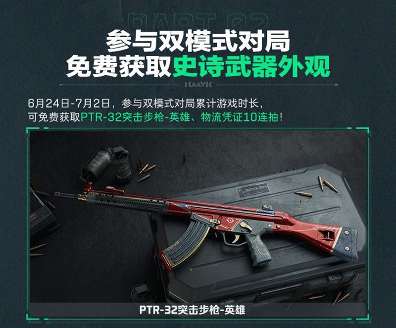 从6月27日至7月2日,玩家们登录游戏即可领取物流凭证10连抽,而从7月3日至7月6日,登录游戏还能获得G3战斗步枪-幻影结构武器外观。同时,参与双模式对局并累计游戏时长,可免费获取PTR-32突击步枪-英雄和物流凭证10连抽,让你的武器库更加丰富多彩。
