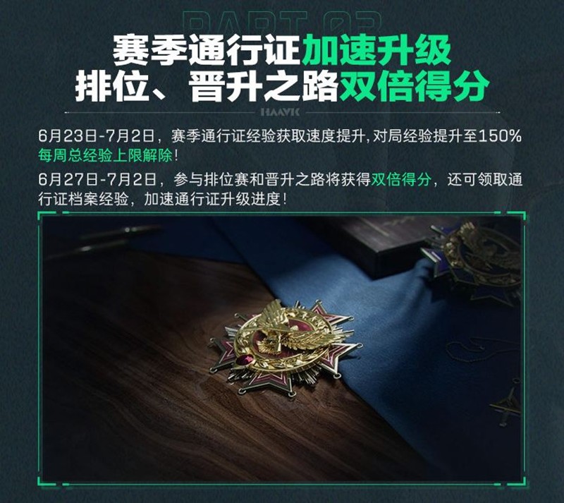 赛季通行证也在这个赛季末迎来了加速升级的机会。6月23日至7月2日期间,赛季通行证经验获取速度大幅提升,对局经验提升至150%,每周总经验上限解除。而在6月27日至7月2日期间,参与排位赛和晋升之路的玩家将获得双倍得分,并可领取通行证档案经验,加速通行证的升级进度。