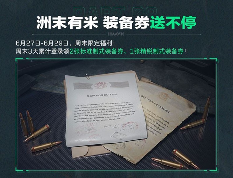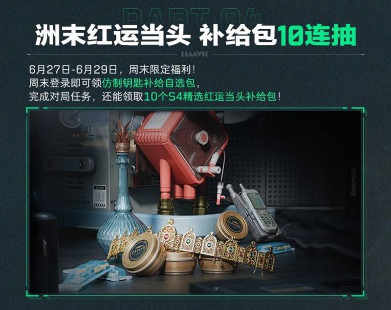 为了庆祝赛季末的到来,游戏还准备了丰富的周末福利。6月27日至6月29日期间,周末登录即可领取仿制钥匙补给自选包,完成对局任务还能获得10个S4精选红运当头补给包。同时,周末3天累计登录可领取2张标准制式装备券和1张精锐制式装备券,让你的装备更加精良。