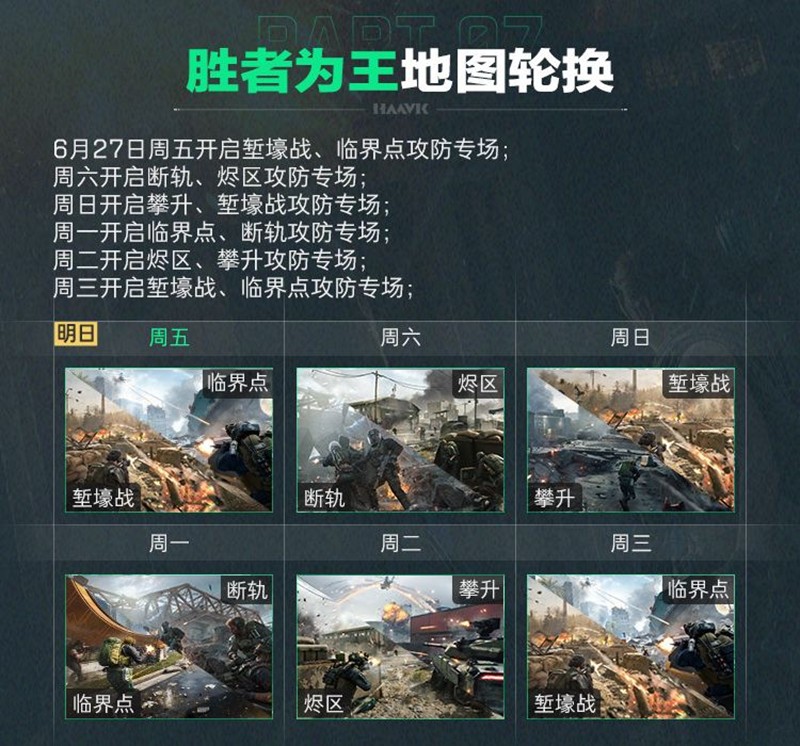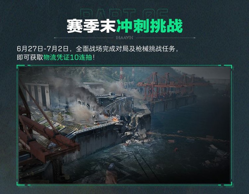 此外,赛季末冲刺挑战将在6月27日至7月2日期间全面展开。玩家们可以在全面战场完成对局及枪械挑战任务,赢取物流凭证10连抽。胜者为王地图轮换也将带来全新的游戏体验,不同的地图将在不同的日子轮换开放,为玩家提供多样化的战术选择和战斗场景。