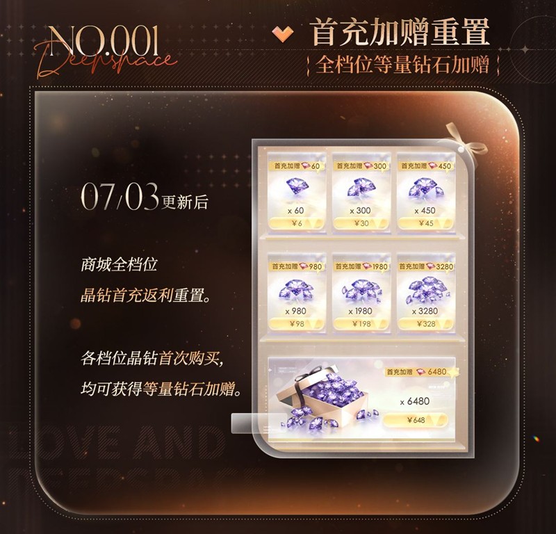 7月3日更新后,商城所有档位的晶钻首充返利都将重置。这意味着玩家首次购买任意档位的晶钻时,都能获得等量钻石的加赠奖励。这项福利对所有充值档位都适用,让玩家能够更轻松地获取游戏资源。