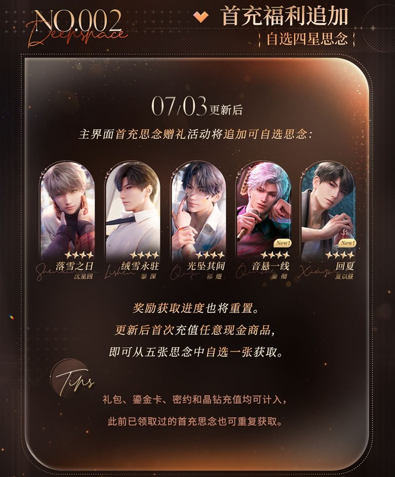 《恋与深空》即将迎来4.0版本"于深空见证的"重大更新,本次更新将带来一系列充值福利活动。从7月3日开始,游戏内将推出多重充值优惠,包括首充重置、自选思念等丰厚奖励,为玩家们带来更多超值体验。