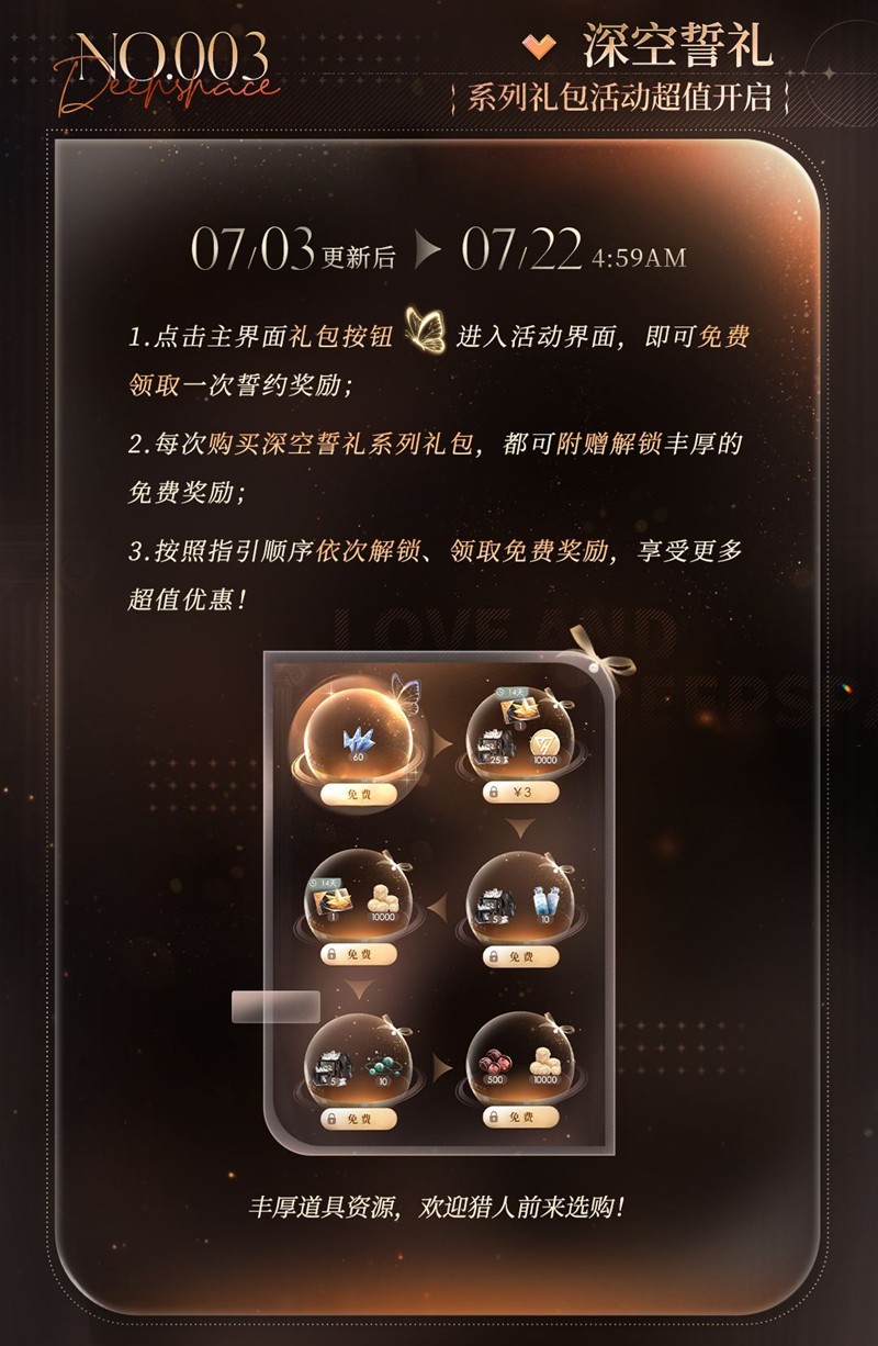 从7月3日到7月22日上午4点59分,游戏内还将开启"深空誓礼"系列礼包活动。购买这些礼包不仅能获得超值道具,还能解锁额外的免费奖励。活动采用顺序解锁机制,玩家可以按照指引逐步领取更多福利。