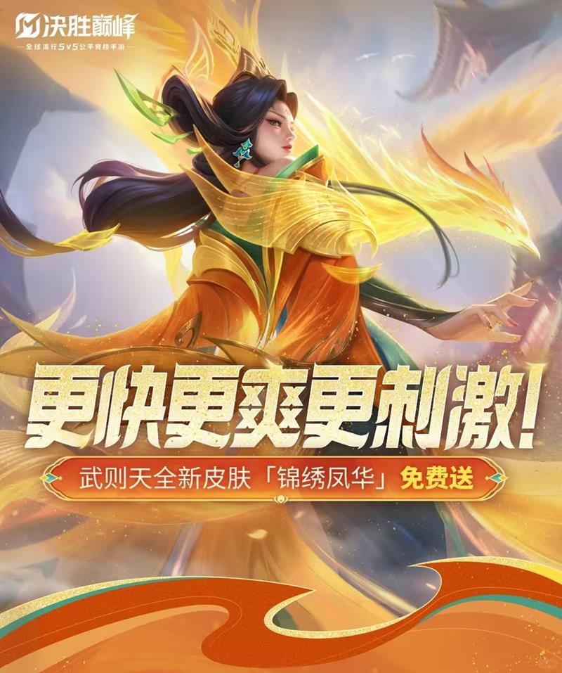 决胜巅峰官方宣布,备受玩家期待的武则天全新皮肤「锦绣凤华」将于7月4日正式上线。这款皮肤以其华丽的视觉效果和独特的设计,吸引了众多玩家的目光。更令人惊喜的是,玩家可以通过参与游戏内的活动免费获取这款皮肤。