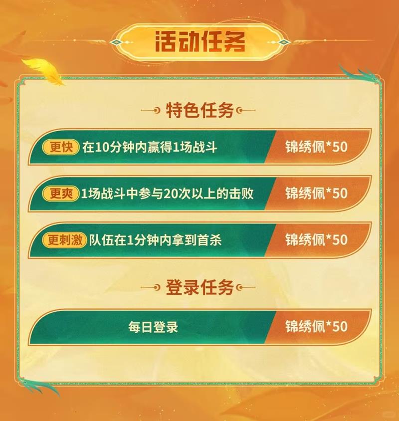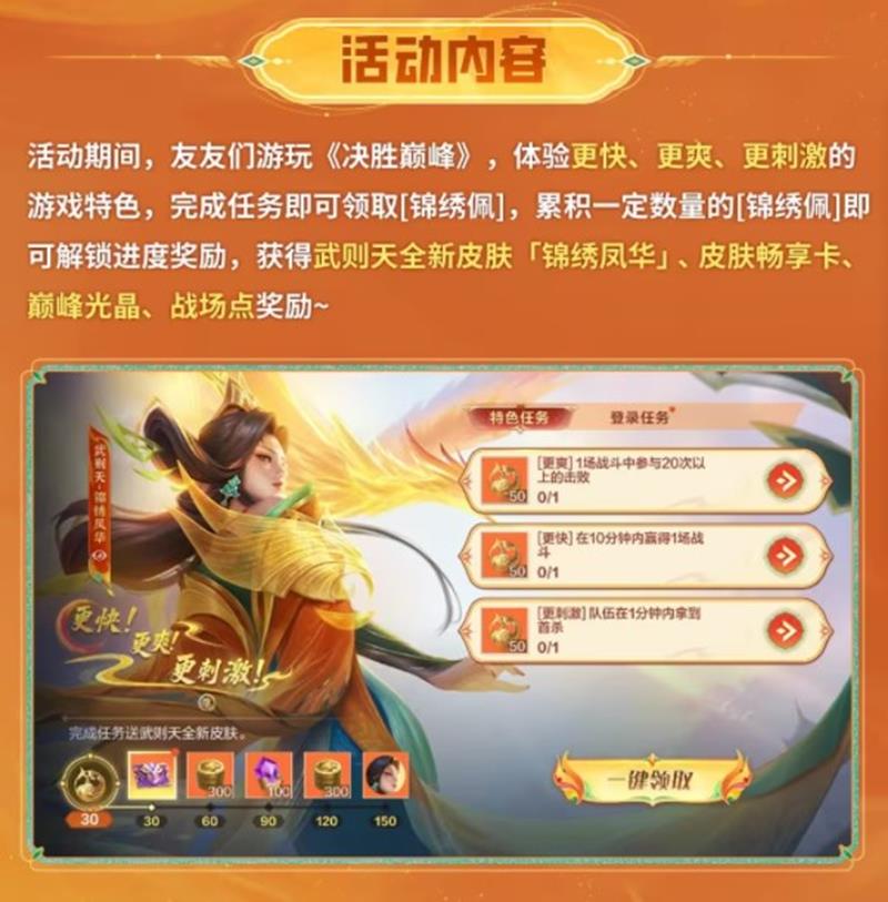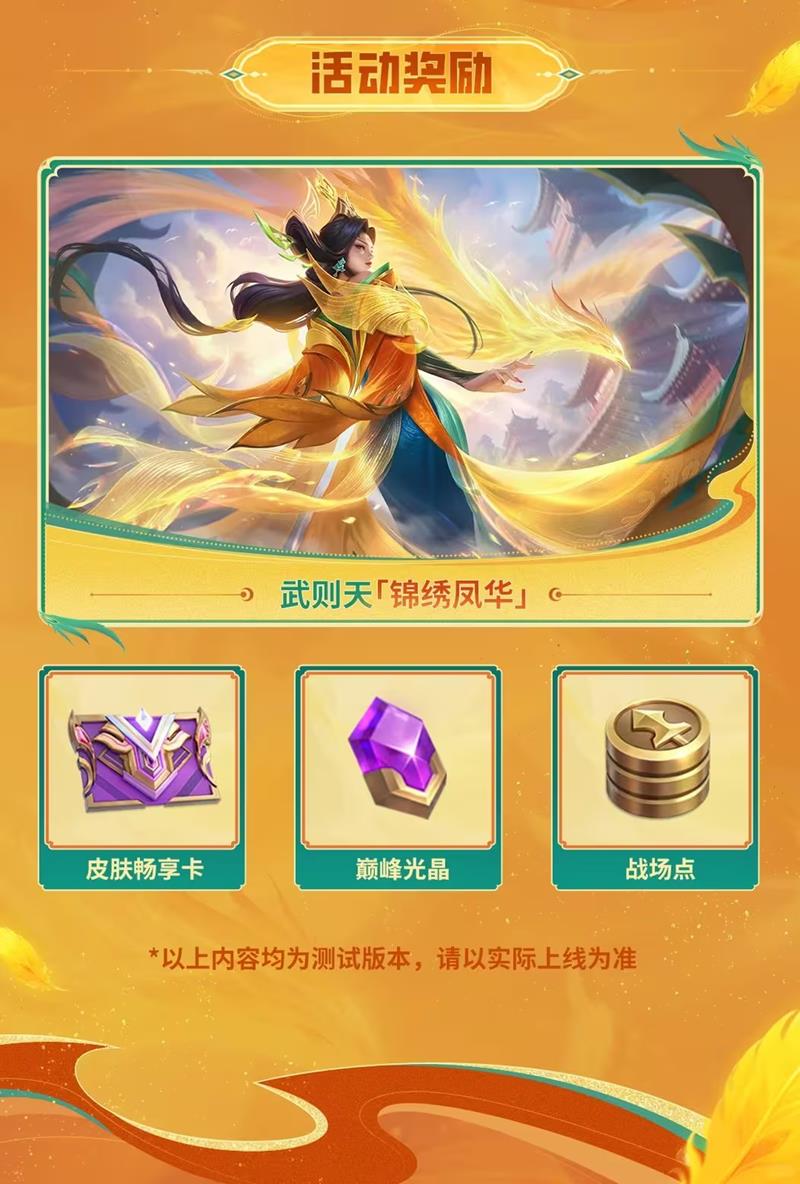 活动内容:玩家在活动期间通过进行对局完成任务,即可免费获取武则天「锦绣凤华」皮肤。此外,还有机会获得皮肤畅享卡、巅峰光晶、战场点等丰富奖励。