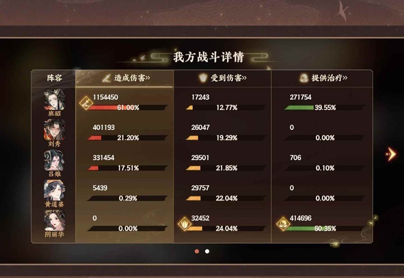 这套一般通关在6-7回合,非常轻松。没有高倍率单体补伤害的话,只带班昭吕雉纯流血也能过,就是回合数长一点。