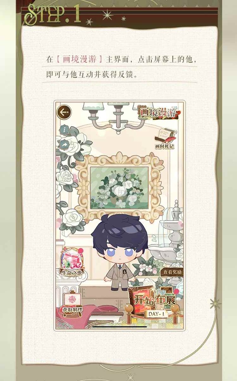 1.活动期间,每日首次完成画廊布展,即可阅读全新趣事剧情并获得李泽言专属手账贴纸。