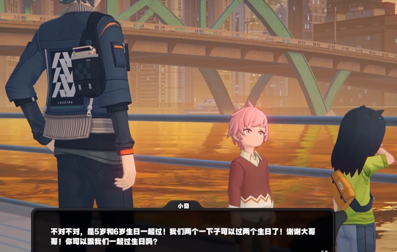 在绝区零中接到这个任务后,系统会指引玩家先与特定角色对话,获得一个小蛋糕作为任务道具。随后需要前往江边寻找两位准备过生日的小朋友,将蛋糕赠予他们。这个过程中,玩家会看到小朋友们在蛋糕上插蜡烛、许愿并交换秘密纸条的有爱场景。