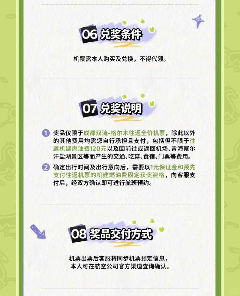 ※ 奖品仅限于成都双流-格尔木往返全价机票,除此以外的其他费用均需您自行承担且支付,包括但不限于往返机建燃油费120元以及因前往或返回机场、青海察尔汗盐湖景区等而产生的交通、吃穿、食宿、门票等费用。