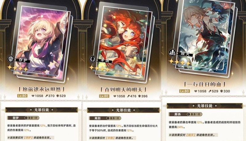 存护【愿旅途永远坦然】适合砂金,但有可能是荒笛的4星光锥,角色未上线,暂时不推荐。丰饶【直到明天的明天】对生命值要求较高,风堇有更多光锥可选,这个光锥可以跳过。