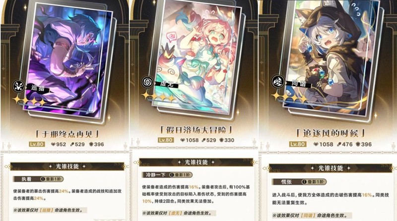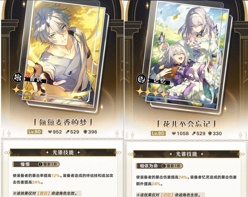 虚无【假日浴场大冒险】是易伤类光锥,用处不大,除非后续虚无角色主推大C。同谐【追逐风的时候】全体击破伤害加成16%,但击破环境尚不确定。智识【香的梦】增加暴击率、大招和追击,适合小黑塔。记忆【花儿不会忘记】是遐蝶的专武下位替代,也可作为其他亿灵相关输出C的光锥。