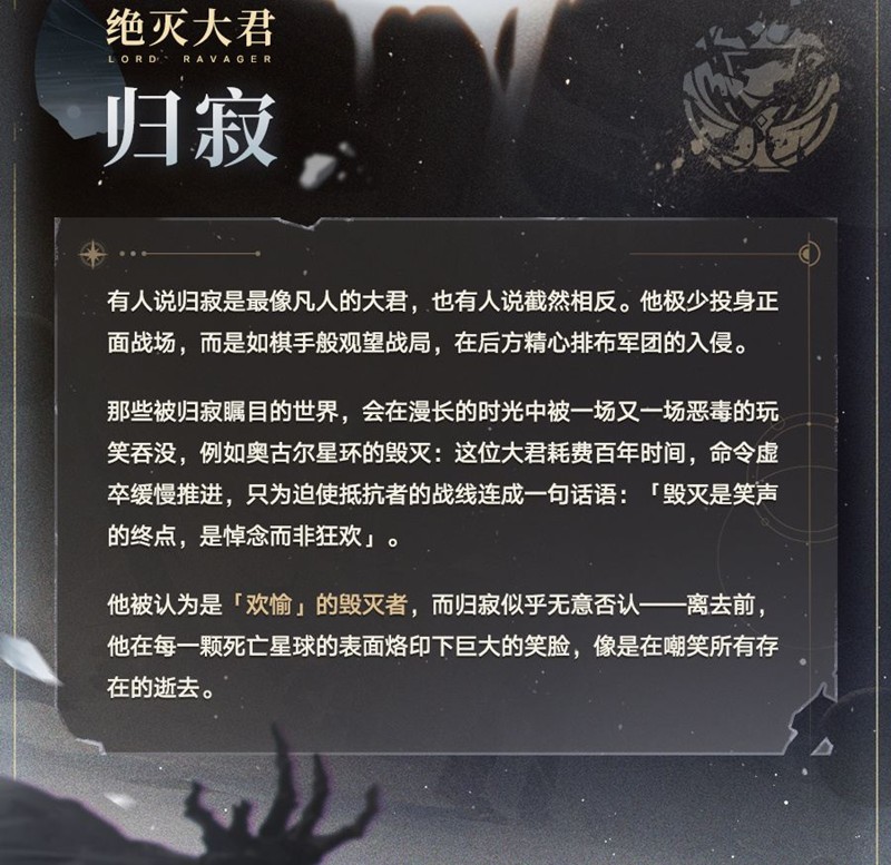 离开战场时,归寂还会在每颗死亡星球的表面烙下巨大笑脸,仿佛在嘲笑所有存在的逝去。这种将“欢愉”与“毁灭”结合的行事风格,让他成为“欢愉”的毁灭者,而他似乎也无意否认这一点。作为绝灭大君的一员,他的存在时刻提醒着旅行者:银河中任何一个世界,都可能成为下一个被“毁灭”命途选中的目标。