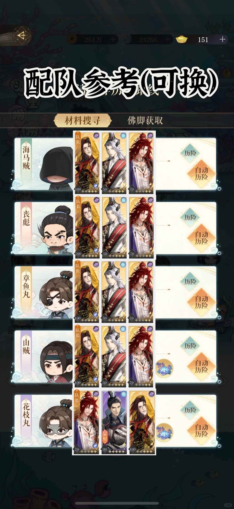 早起打完了,海里捞捞这期是用水系密探历险,增加了成员上限,材料获取应该会比前两期好一点
