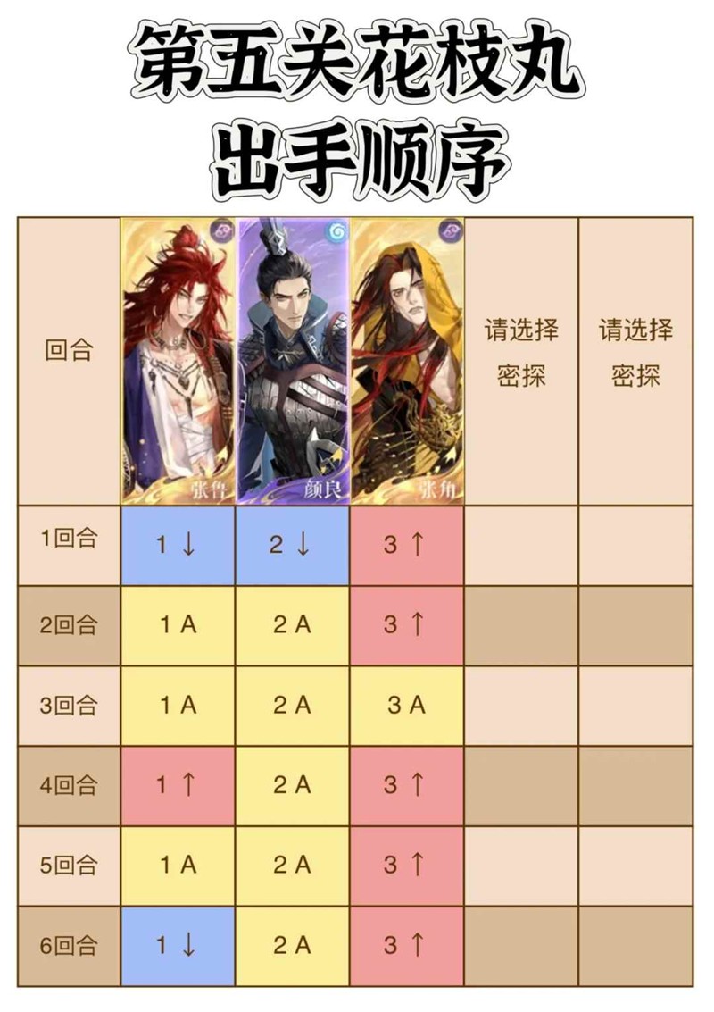 是第五关花枝丸用角鲁队打的出手顺序和练度参考,总结就是boss第一条命时张鲁颜良下拉,把巨浪传给张角,boss第二条命时张鲁下拉,把巨浪传给颜良,其他时候颜良全程普攻,张鲁张角有大放大;