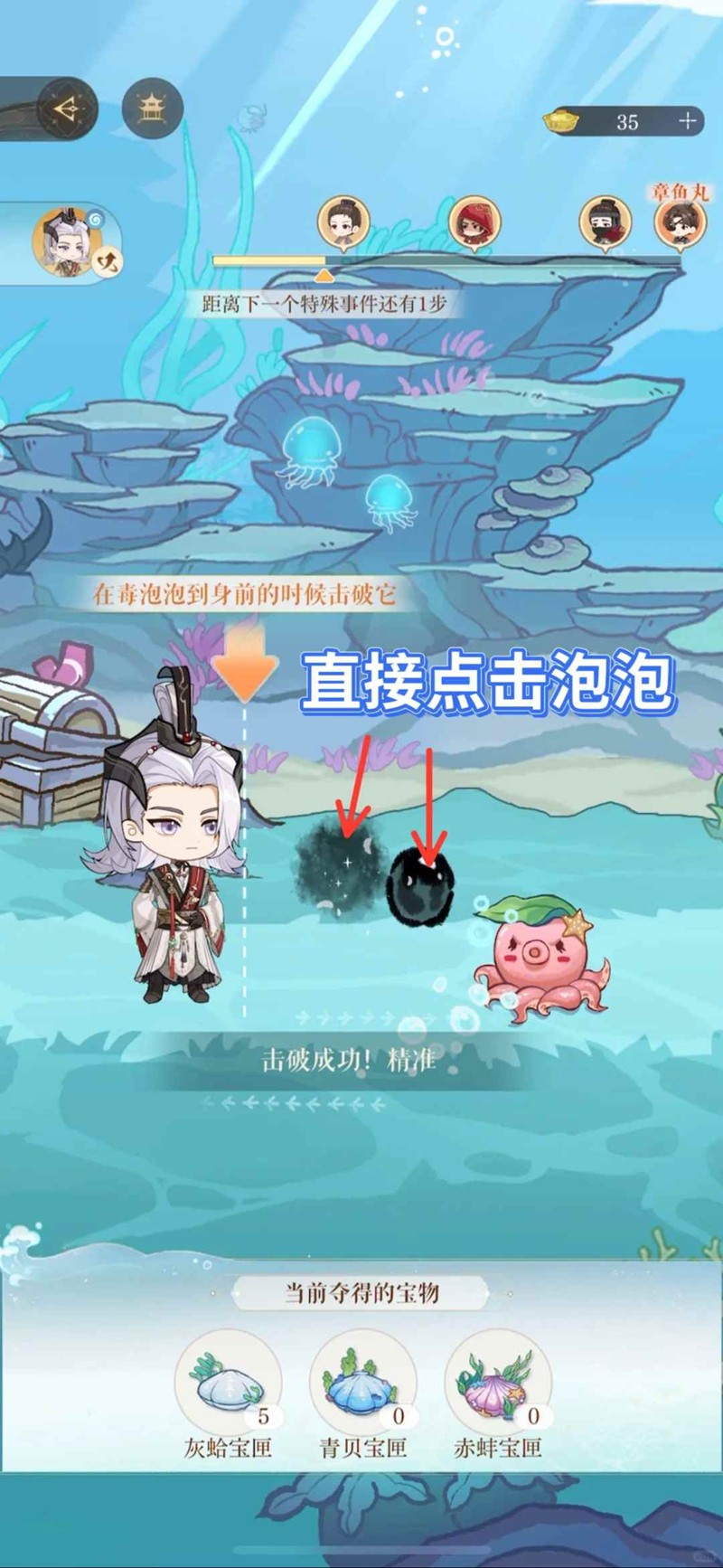 遇到章鱼吐泡泡的,直接点击黑色泡泡,消灭所有泡泡就能过;