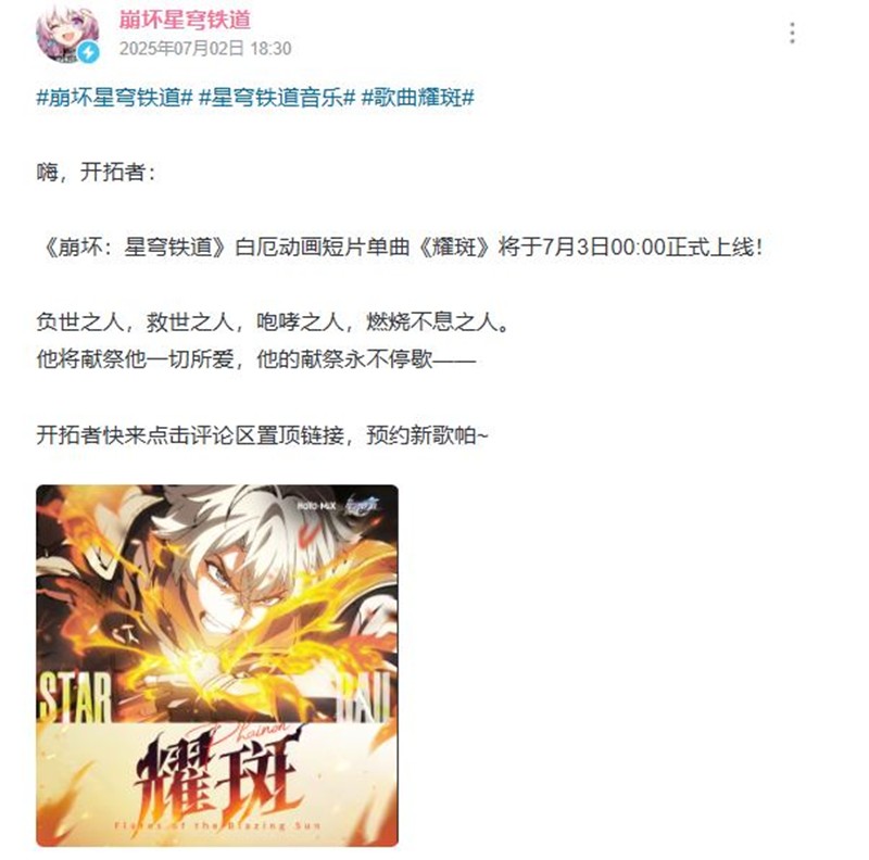 值得一提的是,官方最新发文,该单曲将在明日(7月3日)上线,中文CV方面,白厄由秦且歌配音,幼年白厄由弭洋配音。他们的精彩演绎为角色赋予了生命,让玩家能够更好地感受到白厄的情感和故事。