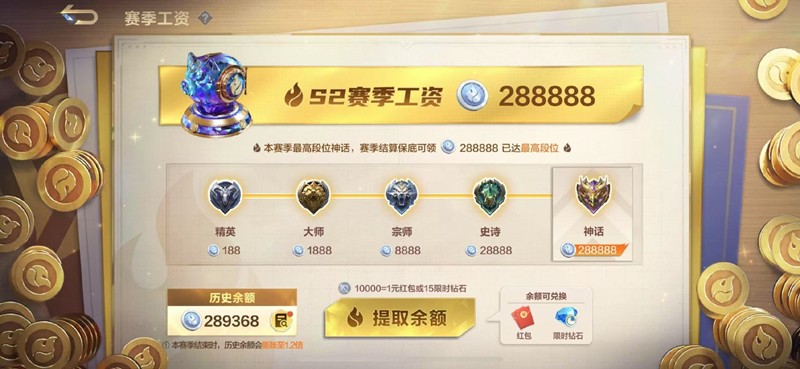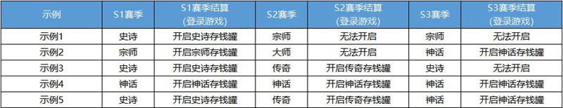 A:您好,除生涯首次开启外,每次开启存钱罐领取赛季工资的需满足:本赛季的最高段位需≥上一个活跃赛季的最高段位(仅比较段位,不计算星星数,例如:上赛季百战神话,本赛季只需神话段位),否则无法在赛季结算时开启存钱罐获得工资。神话段位为每个赛季的最高段位。下方为示例说明