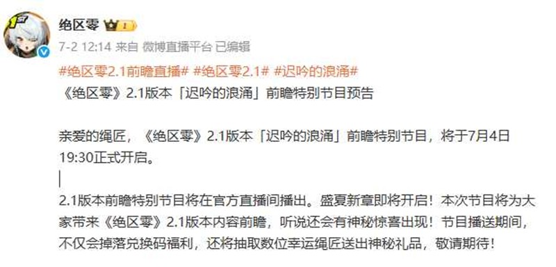 绝区零以其独特的科幻世界观、丰富的角色设定和精彩的剧情深受玩家喜爱。2.1版本的前瞻直播将为玩家带来全新的惊喜和挑战,让我们一起期待今晚7点40分的直播,共同探索《绝区零》的新篇章吧!