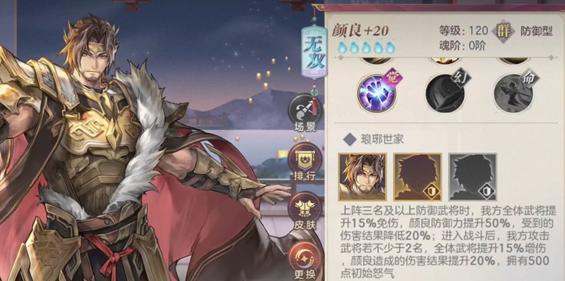 觉醒后的颜良实力更上一层楼,通过多次释放怒气技能可以叠加额外的伤害和减伤效果。他的羁绊系统也为团队提供了强力支援,特别是与防御型武将搭配时,能够提升全队免伤效果,同时增强颜良自身的防御和输出能力。