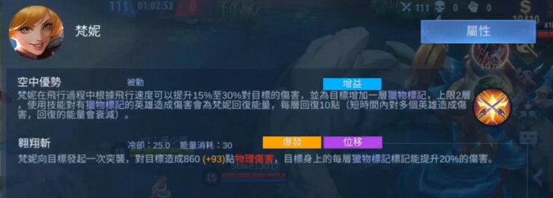 梵妮的被动会根据飞行速度对敌人造成额外伤害,最高可提升20%伤害值。命中目标后会施加两层印记,这些印记能为梵妮提供能量回复效果。这个被动既增强了输出能力,又保证了续航。