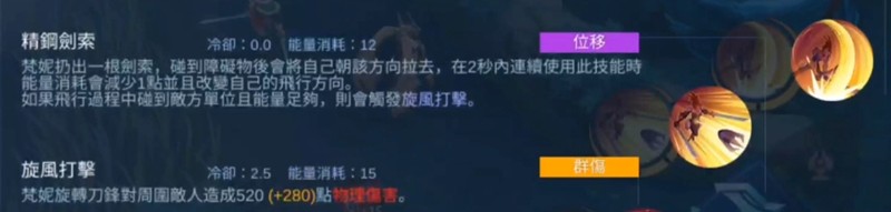 没有冷却时间的位移技能,碰到障碍物会自动贴近。连续使用两次可以改变飞行方向,配合一技能能打出流畅的连招。该技能需要消耗能量,但为梵妮提供了极强的机动性。