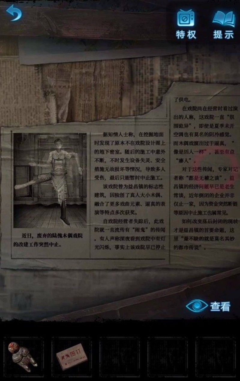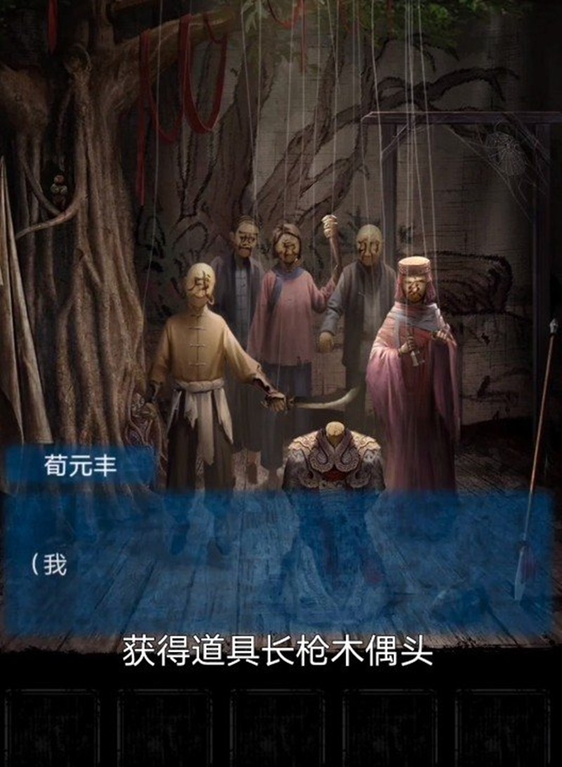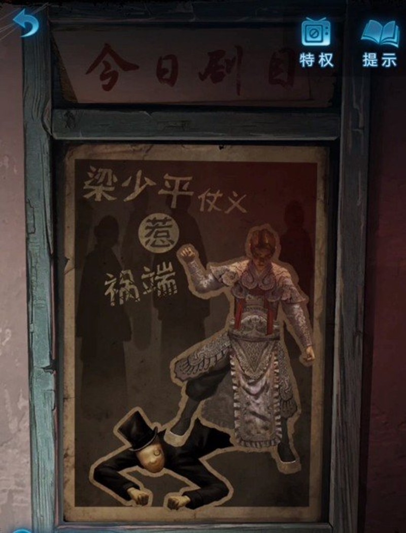 开局需要点击墙边的海报观看"梁少平之死"戏剧,随后收集长枪和木偶头两样关键道具。