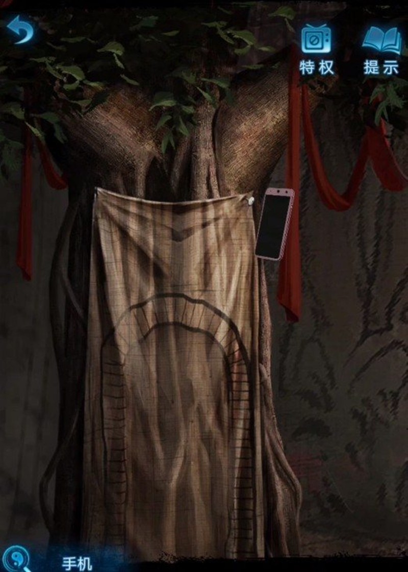 回到戏台场景,用图钉固定大树布帘上的门形图案,就能打开通往密道的入口。