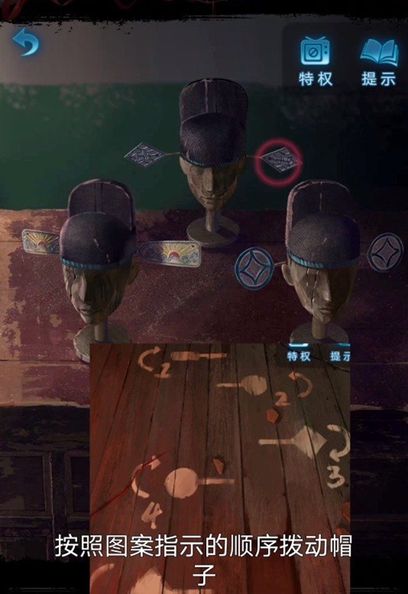 密道房间的地上有个棋盘,移开后能找到上锁的盒子。把这个盒子交给小钟开锁,可以获得空盒子和几本书。根据密室木地板上的提示,拨动帽子两侧后会出现一个活动的陶人。