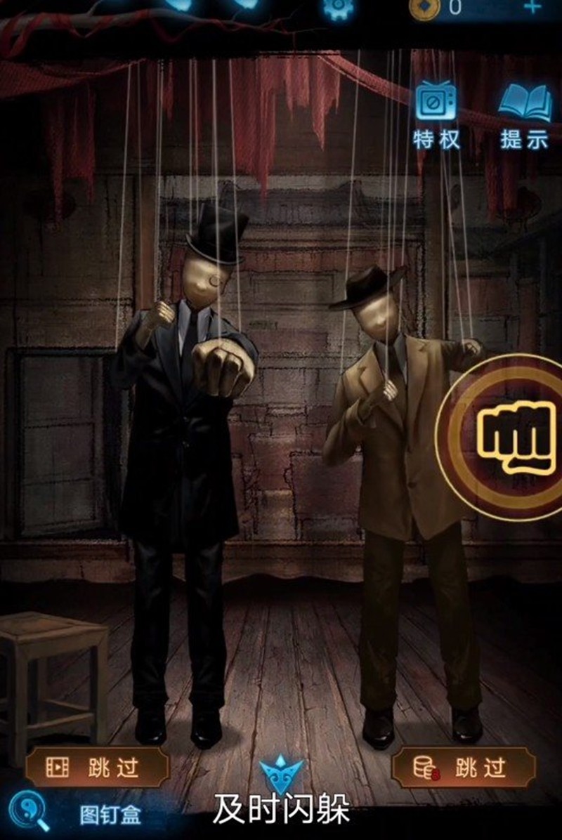 别忘了收集墙上的海报,将其钉在大门旁的海报栏上。再次回到戏台时场景会发生变化,需要躲避两个木偶的攻击,成功后获得一把椅子。将椅子放在通风口下方,依次垫上书本和手机就能爬上阁楼。